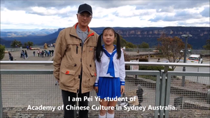 一個11歲的小女孩與雪梨中華文化學校校長一起介紹雪梨藍山國家公園「藍山」的由來與公園內景點「三姐妹峰」的傳說故事。