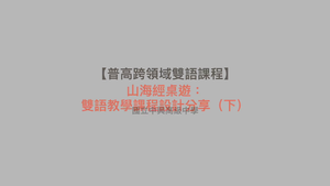 本次課程為跨領域課程_山海經桌遊,本影片延續上集分析本課程設計。教師思考學生的文化脈絡,選擇《山海經》作為課程文本而非以西方妖怪故事將異文化強加於學生身上。在五堂課的設計中,為了使學生深刻理解文本意涵、感受「他者」的概念等,英文在本次課程設計中非主體,而是作為輔助的工具;回應跨越國文、英文、美術及音樂的跨領域課程設計,教師在過程也有機會一步步搭建學生的鷹架,讓學生循序漸進理解文本並連結自身的感受。
