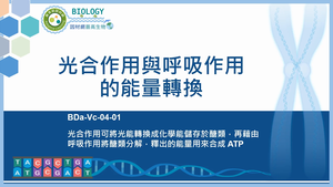 光合作用可將光能轉換成化學能儲存於醣類,再藉由呼吸作用將醣類分解,釋出的能量用來合成 ATP。
