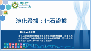 演化的證據可用來驗證生物具有共同祖先的理論,其中化石的證據是古代生物曾經存在與活動的直接證據,可以得知身體構造、生存大致年代、生存環境等