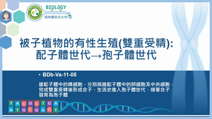 雄配子體中的精細胞,分別與雌配子體中的卵細胞及中央細胞,完成雙重受精後形成合子,生活史進入孢子體世代,接著合子發育為孢子體
