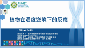 高溫逆境下,植物細胞膜中飽和脂肪酸的比例會增加,並誘導熱休克蛋白的合成;低溫逆境下,細胞膜中不飽和脂肪酸的比例會增加,且有些細胞會合成蔗糖等物質,以降低冰點