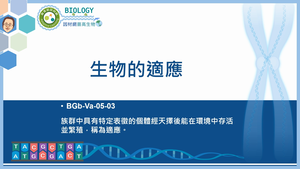 族群中具有特定表徵的個體經天擇後能在環境中存活並繁殖,稱為適應。