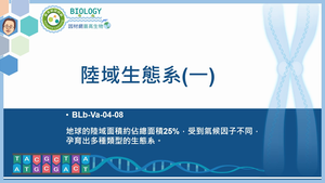 地球的陸域面積約佔總面積25%,受到氣候因子不同,孕育出多種類型的生態系。