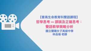 本次的課程為哲學思考—謬誤及正確思考。本影片將呈現老師如何使用多模態的輔助、英文句型的應用、生活中的實際例子等等雙語教學策略,讓學生探討謬誤的種類和不斷思辯,接著藉由任務的設計,引導學生思考這些謬誤,會在生活中如何出現,並在小組討論中構思解決謬誤的方法,由淺入深地讓學生享受在雙語生命教育課中。