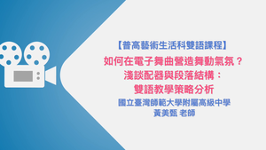 本片介紹藝術生活科【如何在電子舞曲營造舞動氣氛?】的課程架構和教案設計,與老師使用雙語教學的策略。課程內容主要以較多元的流行音樂為主,同時包含了許多音樂創作的元素;而教學上使用多模態教學法,搭配中英的切換,闡述了課堂的運行狀況;最後,本片也提到如何在雙語的前題下兼顧學科知識,並推薦適用音樂課的線上軟體,供雙語音樂老師參考。