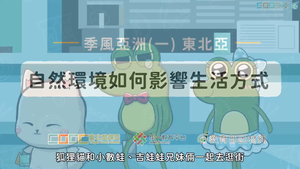 本影片介紹自然環境影響生活方式、飲食、居住等知識內容。