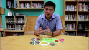 需準備的材料有:剪刀、膠帶、泡棉膠、強力橡皮筋、剪短的筷子、長的筷子、小片PP板、一半的PP板、兩片廢光碟片。
