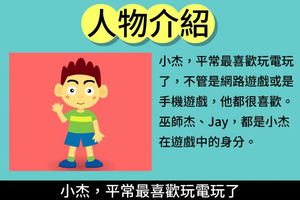 小杰平常最喜歡玩遊戲,不管是網路遊戲或是手機遊戲他都很喜歡。只要一有空他就會上線「練功」,和隊友們一起打怪升級。漸漸的,小杰假日不出門都選擇在家跟網友組隊打怪,甚至在上課的時候也一直都在想遊戲裡面的事情,你也會玩網路遊戲嗎?玩網路遊戲有什麼需要注意的事情呢?