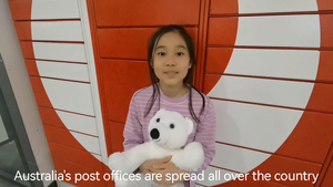 介紹澳洲當地郵局。內容包含:營業時間、郵局外觀、販售商品、櫃臺服務業務、自助服務機器和自動販賣機、包裹置物櫃服務、郵筒,以及郵務車和郵差等。