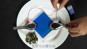 實驗器材: 蝶豆花、吉利丁、熱水、冷水、電池、果凍盒、鱷魚夾組