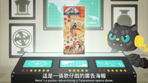 本集內容對應108課綱中「日本帝國時期的臺灣」單元,引導觀眾思考傳統與現代之間的辯證關係。 影片從這張《狸貓換子》的海報,看見傳統戲曲與現代科技的有趣結合 。當時從西方引進的黑膠唱片,不僅發行西洋、日文音樂,也灌錄臺語流行歌與戲曲 。這證明了傳統藝術並未消失,而是使用新載體,以另一個面貌流傳下去 。