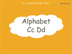 本影片所學字母為Cc, Dd ,透過動畫學習字母筆畫,影片中所使用的單字包含:C開頭單字:car, cat, coffee,D開頭單字:duck, doll, dolphin。