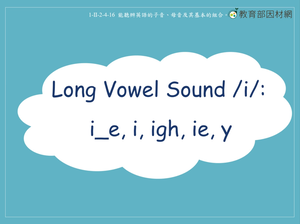 本影片所學為長母音i_e, i, igh, ie, y的發音,透過單字和句子來讓學生練習發音。影片中i所使用的單字:iron, iron man;ie所使用的單字:pie, tie;i_e所使用的單字:rice, bike;igh所使用的單字:high, light;y所使用的單字:why, shy。影片中所使用的句子是: Jack is flying a kite./It is flying high in the sky./ Jane is a shy girl. /She likes to ride a bike./She buys some pie for dinner.