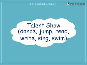本影片所學為能力相關單字,透過情境讓學生了解如何使用能力相關單字,影片中帶到的單字包含:Dance, Jump, Read, Write, Sing, Swim並透過練習題讓學生能更加熟悉這些單字。