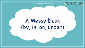 本影片所學為位置相關字詞,透過情境引導學生將物品擺放至正確位置,影片中使用到的單字包含:by, in, on, under。影片中所提及相關單字包含,trash can, markers, case, chair, notebook, desk, water bottle.。影片的最後,透過練習題讓學生根據敘述選出正確的圖片。使用的句型包含:First, can you help me put the trash can by the table?/The markers are in the case./Please put the case under the chair./The notebook is on the desk./The water bottle is in the drawer.。