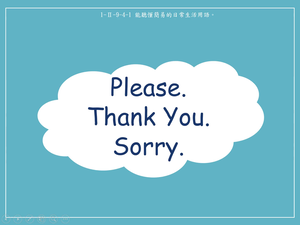 本影片所學為問候語Please. Thank you. Sorry.,透過動畫說明問候語的使用情境,例如用please來展現禮貌(being polite)或是表達請求(making a request),像是在教室中可以聽到老師說Open (Close) your book, please./Raise your hand, please.;點餐時可以說A hamburger, please.。Thank you用來表達對他人的感謝,當我們撞到他人時則會說I'm sorry.。影片的最後,利用練習題讓學生選出符合圖片情境的生活用語。
