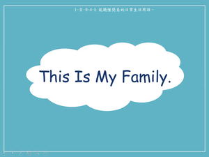 本影片所學為家人This is my family,透過動畫中主角介紹自己家人學習句型This is _______.,以及單字(dad, mom, parent, brother, sibling, grandpa, grandma, grandparent, family tree)。影片的最後,利用練習題讓學生選出正確的句子或字詞。