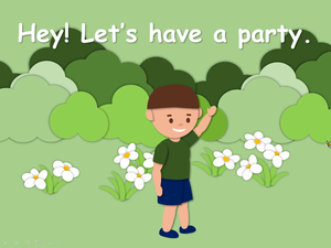 本影片所學為常用語-Follow me.,以男孩與朋友說Let's have a party為情境學習常用語Follow me.。影片的最後,利用練習題幫助學生複習常用語Follow me./I am hungry./Let's play./Look!,並透過練習題讓學生選出與常用語相符的圖片。