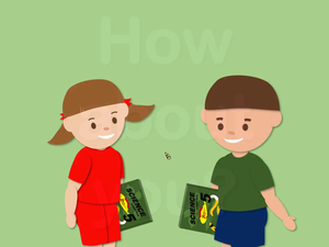 本影片所學為問候語How about you,透過動畫中男孩與女孩的互動學習How about you?的使用情境,例如女孩詢問男孩What are you doing?時男孩回應I'm studying. 並反問女孩How about you?,而女孩則回應Me, too.。在影片的後半段,利用練習題讓學生選出與常用語相符的圖片。