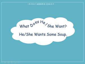 本影片所學為食物相關句型,使用some表示不可數名詞,透過動畫中角色互動學習問句What does he/ she want?,以及回應句He/ She wants some _______?,影片中使用的例句包含:He/ She wants some food/ drinks.,並透過練習題引導學生選出對應的句型圖片。