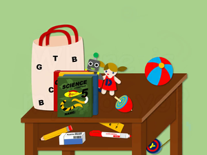 本影片所學為位置相關句型,使用問句Where is my ______? (yo-yo/ ruler/ robot),依照動畫裡的畫面,運用不同的介係詞+地點(under the desk/ in the desk/ by my bag/ on the blue book)來表達不同物品的所在位置。