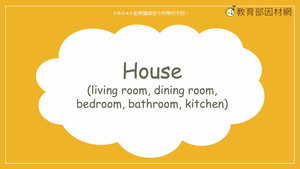 本影片所學為房間名稱相關字詞-bedroom/ living room/ kitchen/ bathroom/ dining room,透過介紹主角Becky理想中的房子為情境,讓學生學習每間房間對應的單字與功能。影片的最後透過圖片以及敘述,讓學生選出Becky以及Tom所在的房間名稱。使用的句型包含:She wants to have a big bed in her bedroom. She can sleep well in her bedroom./When she wakes up, she goes to the kitchen to see what she can eat for breakfast./Then, she goes to the dining room to enjoy her breakfast./Becky always remembers to brush her teeth in the bathroom after eating something./At last, there is a big living room in her house. With this living room, she can invite her friends to her place.