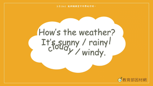 本影片所學句型為How' the weather? ,透過聆聽世界各地的天氣預報內容以及閱讀天氣預報圖表,協助學生複習單字sunny, rainy, cloudy, windy,以及學習疑問句How's the weather?和回應句It's ______.(sunny, rainy, cloudy, windy)。影片的最後,讓學生根據動畫或圖片情境,回答出正確的句型及天氣名稱。此外,也讓學生將所學句型進行重組。使用的句型包含:In Asia, it is sunny. A bright sunny day./In America, it is rainy. Don't forget to bring an umbrella with you./In Europe, it is cloudy./In Australia, it is windy. Strong wind.