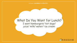 本影片所學句型為-What Do You Want for Lunch?透過不同的場景以及人物之間的日常對話,學習問句What do you want for lunch?以及回應句I want ______. ( a hamburger, a hot dog, three hamburgers )/ I want some _________. ( water, juice, ice cream, milk, hamburgers, hot dogs)。