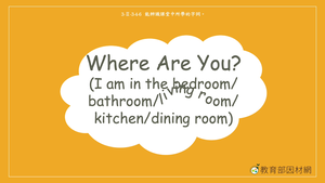 本影片所學句子為Where are you?,透過媽媽與Ben的對話,學習疑問句Where are you?和回應句I'm in the ______. ( bedroom, bathroom, living room, kitchen )。此外,也藉由圖片協助學生複習所學字詞-bedroom, bathroom, living room, kitchen。影片的最後,讓學生根據聽到的敘述圈出正確的句子。此外,也讓學生將所學句型進行重組。