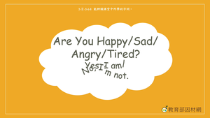 本影片所學句子為Are you happy?,透過表情符號的圖示及動畫學習描述情緒的字詞:happy, sad, angry, tired,並藉由不同人物的對話和情境練習句子Are you ______? ( happy, sad, angry, tired ),以及回應句Yes, I am./ No, I'm not.。影片的最後,讓學生根據圖片圈出正確的回應句。此外,也讓學生將所學句型進行重組。