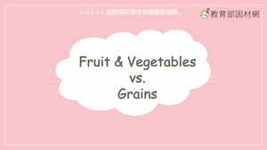 本影片所學為食物的分類-水果(Fruits)、蔬菜類 (Vegetables)及穀物(Grains),屬於穀物的食物包含rice, wheat, oats, cereal, bread, pasta;屬於水果的食物有:apple, peach, watermelon;屬於蔬菜的食物則有:broccoli, carrot, eggplant。影片中藉由在超市購物的情景,讓學生練習分辨蔬果及穀物。影片的最後,讓學生根據分類選出正確對應的食物。