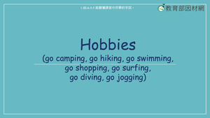 本影片所學為休閒活動相關字詞如go camping, go hiking, go swimming, go shopping, go surfing, go diving, go jogging,透過圖片讓學生學習相關字詞,並將正確的單字填入句子中。影片中所使用的例句為:I _______ in my free time. (go camping./go hiking/go swimming/go shopping/go surfing/go diving/go jogging)。
