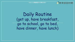 本影片所學單字為 get up, have dinner, have breakfast, go to school, go to bed, have dinner, have lunch,透過拍攝Vlog的情境引導學生使用日常生活相關單字。影片的最後利用練習題讓學生根據時間圈選出動應的日常生活活動。影片中使用例句包含:Mary gets up at 8 o'clock. She is ready to start her new day./At eight twenty, Andy has breakfast. Wow! The food looks so yummy!/Tom goes to school at 8:30. It's his favorite English class!/After class, it's time for lunch. Gary has lunch at 12. /At 7 o'clock, it's time for may people to have dinner./Finally, it's time for bed. She goes to bed at 9.