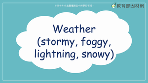 本影片所學單字為stormy, foggy, lightning, snowy,透過字卡以及不同的天氣情況,讓學生學習如何使用字詞。影片的最後利用練習題讓學生根據敘述圈選出對應的天氣。影片中使用例句包含:It’s foggy. The mother asks the boy to be careful when going outside./It’s lightning. It’s scary. But don’t be scared! It is natural./It’s snowy. They want to go outside and build a snowman./It’s stormy. Nobody should go out. It is dangerous.