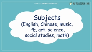 本影片所學為課程科目相關單字English, Chinese, music, PE, art, science, social studies, math,透過字卡以及Jack一周課表的圖片,讓學生學習如何使用字詞。影片的最後利用練習題讓學生根據課表圈選出動應的科目名稱。影片中使用例句包含:What is the first (second/third/fourth/fifth) class?/It's English (PE/art/science/social studies/math) .