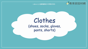 本影片所學為衣物相關單字shoes, socks, gloves, pants, shorts,影片中透過字卡以及協助主角Sandy準備爬山裝備的情境,讓學生學習如何使用字詞。影片的最後利用練習題讓學生根據聽到的敘述選出正確對應的衣物圖片。影片中使用例句包含:First, she needs her pants. /Shorts may not be ideal when going hiking./Then, she needs her socks./Last, she needs her gloves.