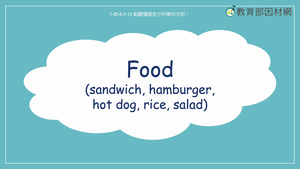 本影片所學為食物相關單字sandwich, hamburger, hot dog, rice, salad, pizza,影片中透過字卡,讓學生認識字詞。此外,也讓學生根據菜單上的價格,協助顧客計算購買食物的總金額。影片的最後利用練習題讓學生根據菜單上的金額回答問題。影片中使用例句包含:He can choose to eat some salad./She can order a hot dog and some rice./A sandwich and a hot dog are only 130 dollars./A pizza is 220 dollars. /The girls order a sandwich, a hamburger, a hot dog, and some salad to share.