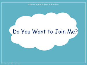 本影片所學對話用語Do you want to join me?,透過動畫中的情境與角色間的對話來練習,了解該句用語是用於詢問他人是否要一起做件事的意願,最後利用練習題引導學生選出正確答案,並熟悉該句用語代表的意義。