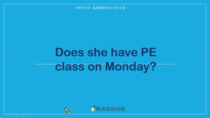 本影片所學為詢問資訊相關句型,結合先前所學的星期與學科項目,觀察主角Sherry的課表,並帶出問句Does she have ____ class on _______?與答句Yes, she does. No, she doesn't.,最後利用練習題引導學生對照Tony的課表並正確應用所學句型。