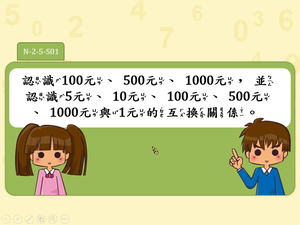學習內容:N-2-5 解題:100 元、500 元、1000元。以操作活動為主兼及計算。容許多元策略,協助建立數感。包含已學習之更小幣值。