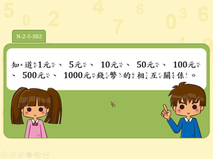 學習內容:N-2-5 解題:100 元、500 元、1000元。以操作活動為主兼及計算。容許多元策略,協助建立數感。包含已學習之更小幣值。