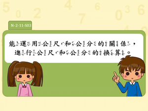 學習內容:N-2-11 長度:「公分」、「公尺」。實測、量感、估測與計算。單位換算。