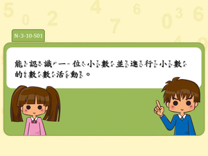 學習內容:N-3-10 一位小數:認識小數與小數點。結合點數、位值表徵、位值表。位值單位「十分位」。位值單位換算。比較、加減(含直式計算)與解題。