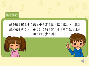 學習內容:N-3-15 容量:「公升」、「毫升」。實測、量感、估測與計算。單位換算。