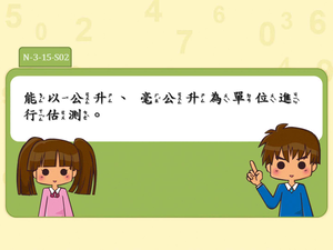 學習內容:N-3-15 容量:「公升」、「毫升」。實測、量感、估測與計算。單位換算。