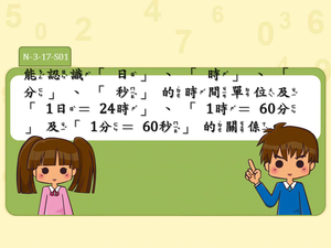學習內容:N-3-17 時間:「日」、「時」、「分」、「秒」。實測、量感、估測與計算。時間單位的換算。認識時間加減問題的類型。