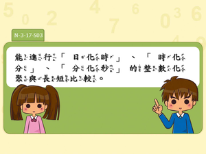 學習內容:N-3-17 時間:「日」、「時」、「分」、「秒」。實測、量感、估測與計算。時間單位的換算。認識時間加減問題的類型。
