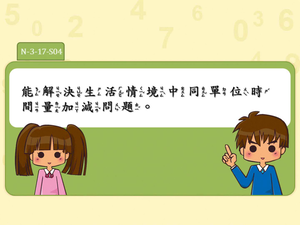 學習內容:N-3-17 時間:「日」、「時」、「分」、「秒」。實測、量感、估測與計算。時間單位的換算。認識時間加減問題的類型。