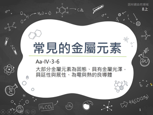 大部分金屬元素為固態、具有金屬光澤,具延性與展性、為電與熱的良導體